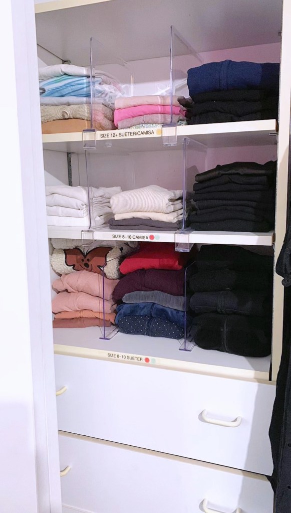 Now that we’ve made some breathing room, it’s time to categorize. Keeping like items together—shirts with shirts, school tops separate from weekend clothes, pajamas in their own section—makes it so much easier to find what you need and keep things neat.