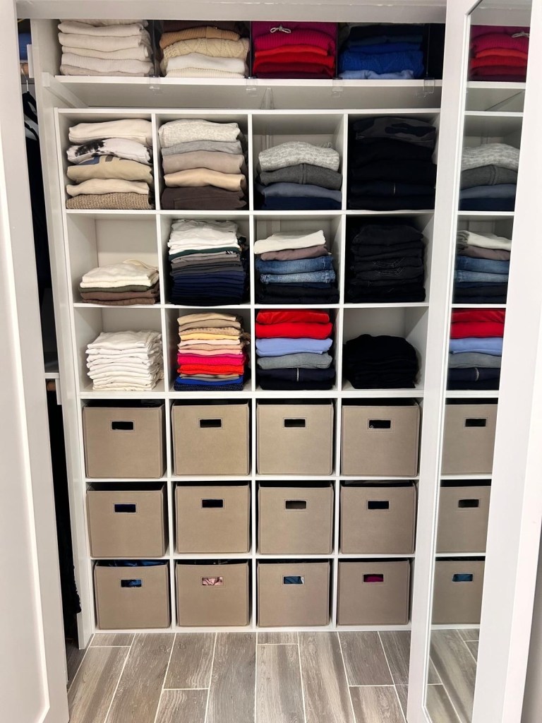 Extra shelving is a lifesaver for those needing more folding space. One of my clients recently moved into a new apartment and needed more storage but wasn’t keen on investing in a pricey built-in for a temporary space. So, we got creative—an inexpensive cube unit turned into extra shelving that gave her plenty of room to neatly fold and store clothes. Thinking outside the box (or in this case, inside the cube!) is a simple way to maximize closet space without breaking the budget.