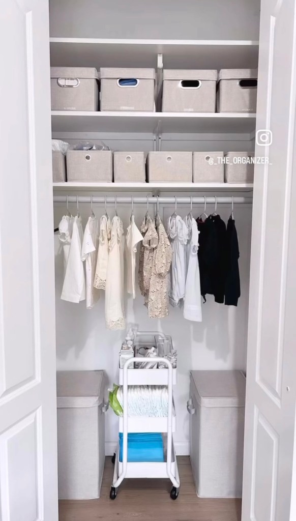 Matching hangers may seem minor, but trust me, they’re a game-changer. They don’t have to be fancy, but when they coordinate, they instantly upgrade the look of a closet and help maximize hanging space. A small change, but a big difference.