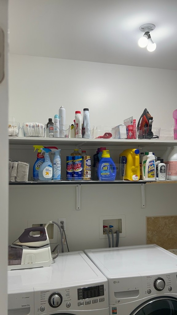 Before you organize anything, start fresh. Empty the entire space—yes, even the cabinet above the dryer that hasn’t been opened since the appliance guy was here.