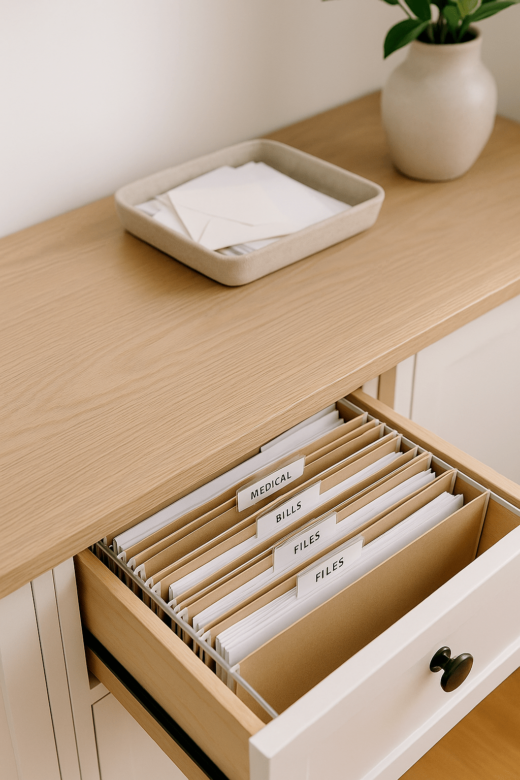 ● File System: Use a file box and give each child their own main folder. Inside that folder, create subcategories by grade or year (e.g., “1st Grade,” “2nd Grade,” “3rd Grade”) so everything stays organized and easy to browse.