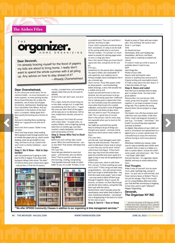 Make it easy on yourself: turn on some music, grab a garbage bag, and get it done—on your own or with the kids. And those memory boxes or folders? They’re not just for storage. They’re fun to pull out on a long Shabbos afternoon when your kids feel like reminiscing or laughing at how they used to spell “elephant.”