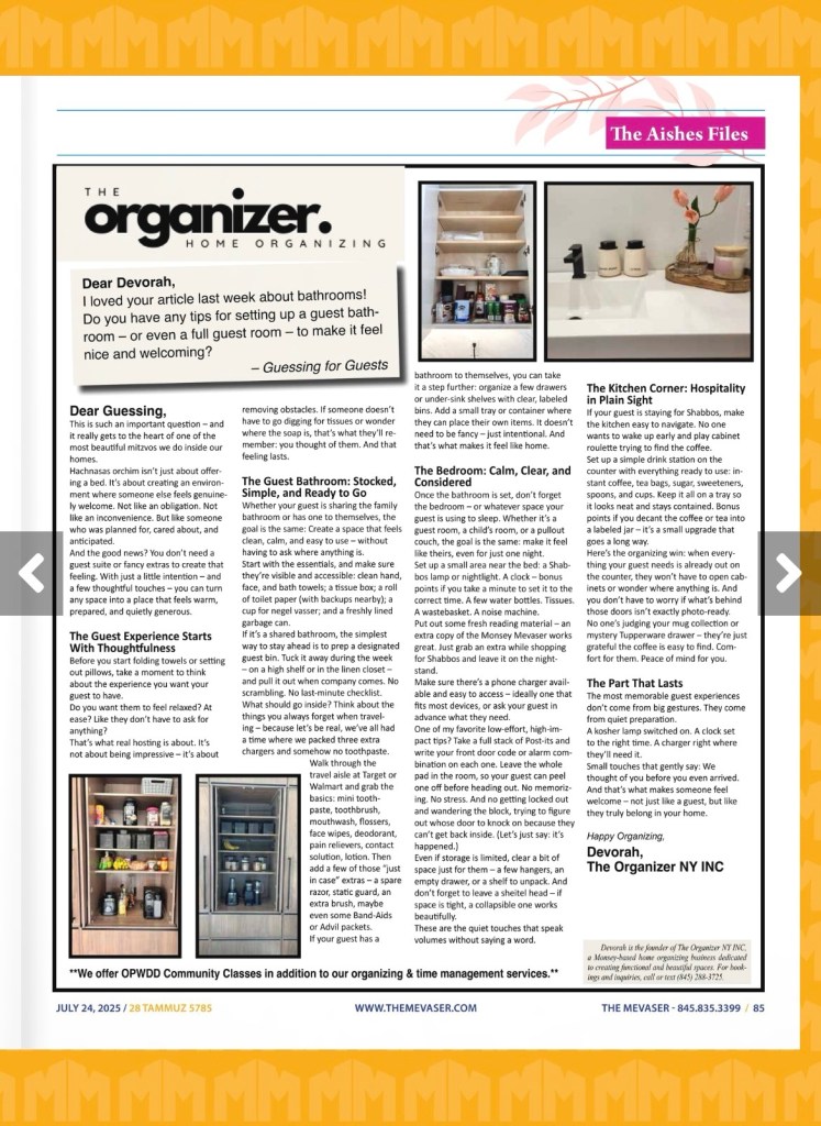 Put out some fresh reading material—an extra copy of the Monsey Mevaser works great. Just grab an extra while shopping for Shabbos and leave it on the nightstand.