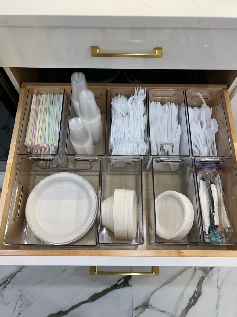 If you’ve got a deep drawer, make the most of it. Use bins to divide your paper goods and cutlery – or, if it’s easier, keep the plastic cutlery in its original boxes. Just add a few drawer dividers to keep everything neat and easy to grab.