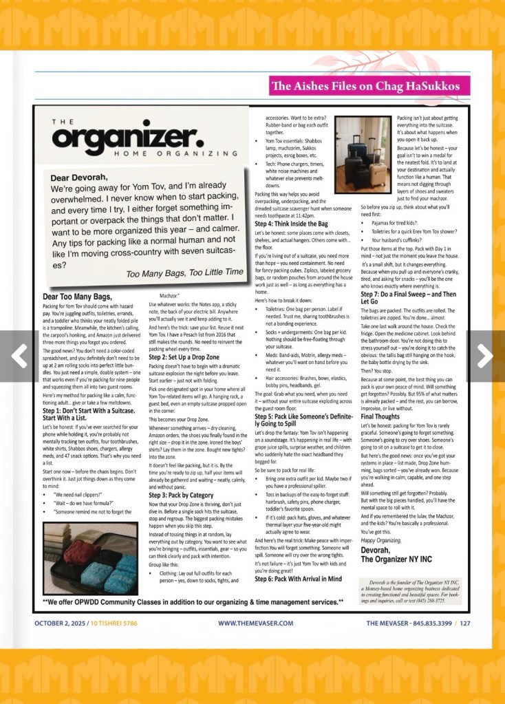 We’re going away for Yom Tov, and I’m already overwhelmed. I never know when to start packing, and every time I try, I either forget something important or overpack the things that don’t matter. I want to be more organized this year – and calmer.